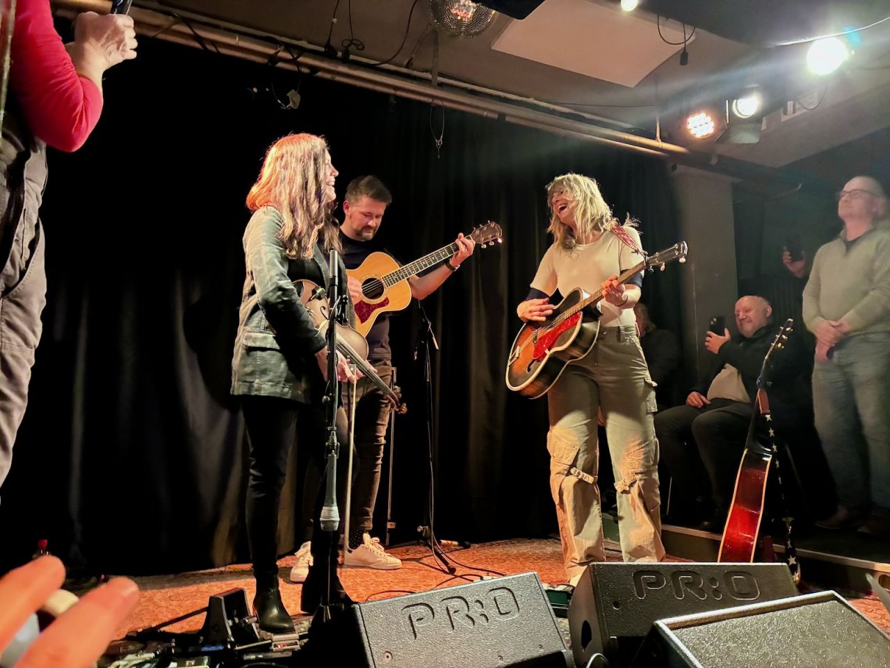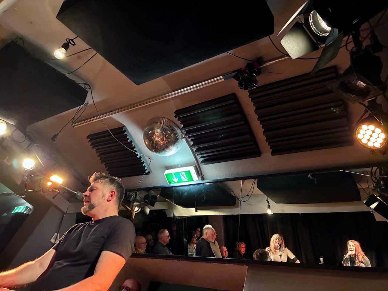 Der Stimmung war die „kuschelige“ Atmosphäre durchaus zuträglich. Ich ergatterte einen „Bodensitzplatz“, aber der Preis für meine Anlehnmöglichkeit an einer Säule war, dass ich nur in eine Richtung schauen konnte – nämlich die mit Jake, dem Bassisten. Ziemlich schnell jedoch entdeckte ich den Spiegel, der über Jake prangte und der mir einen mehr oder weniger freien Blick auf die beiden Sängerinnen gewährleistete. Bei der Zugabe schließlich wurde mir sogar ein Platz in anderer Blickrichtung überlassen, so dass ich zum ersten Mal an diesem Abend (wieder eine Premiere!) die Band nicht nur live hörte, sondern auch „richtig herum“ sehen konnte.